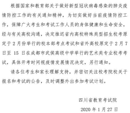 关于推迟四川省2020年部分普通高校特殊类型招生专业校考时间的公告