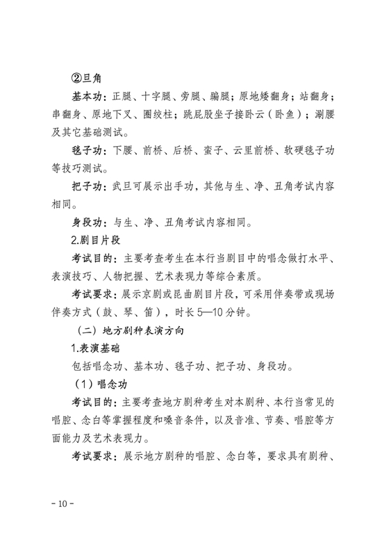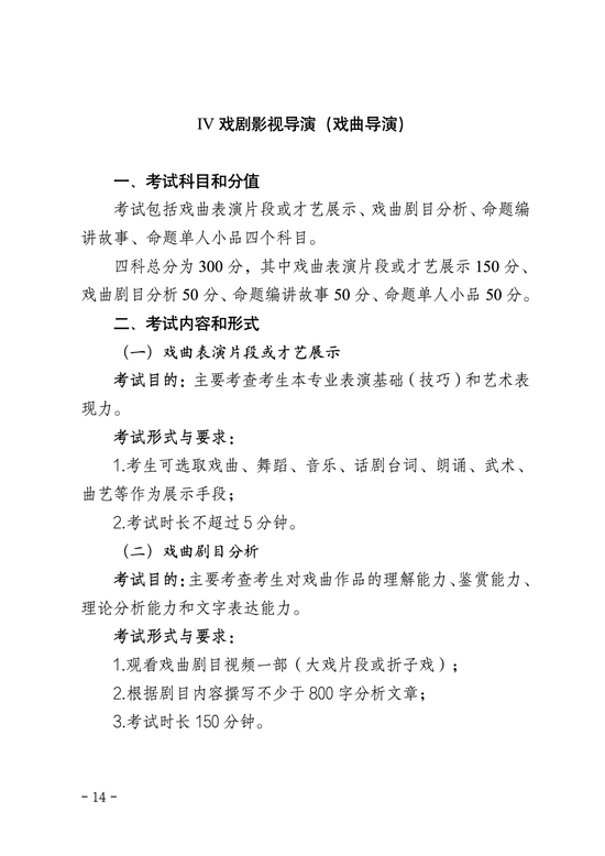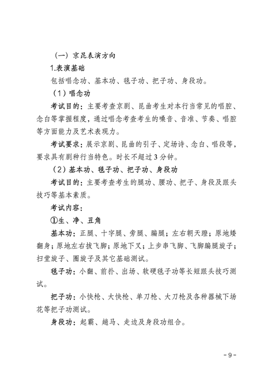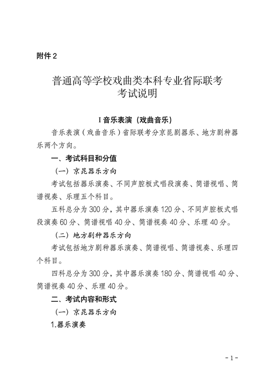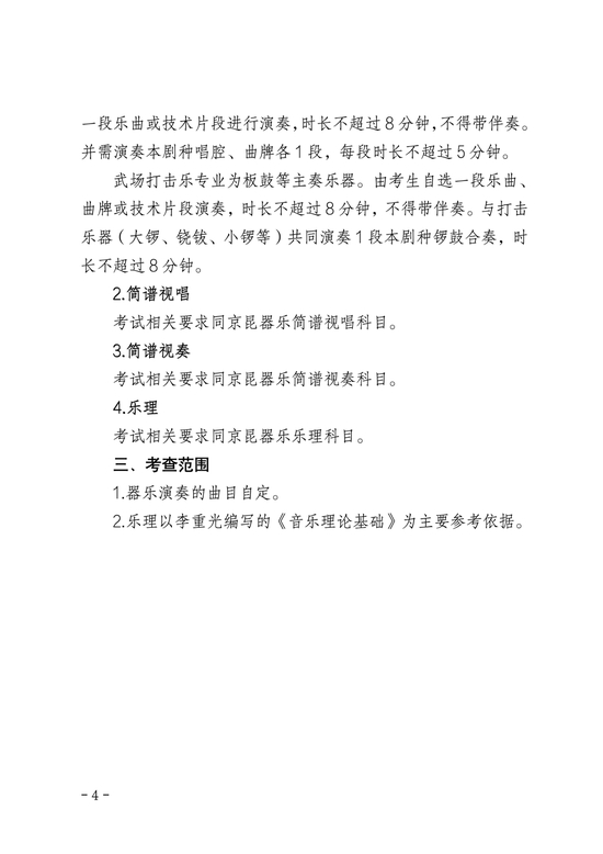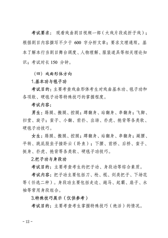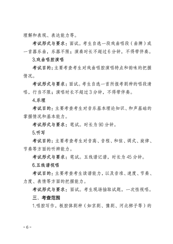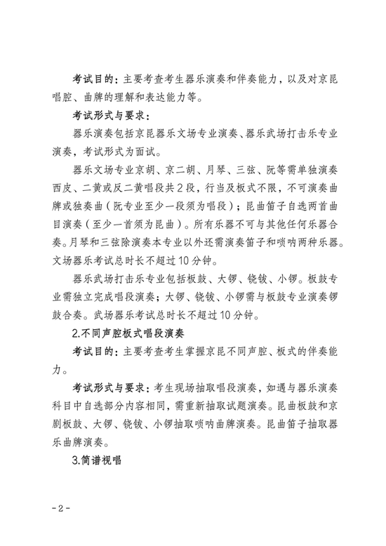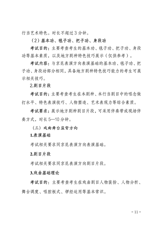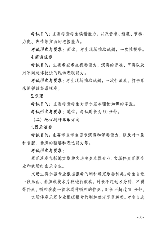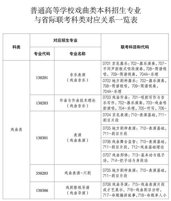 各专业(剧种)的科目和分值、内容和形式、考试要求、考查范围等具体信息详见戏曲类本科招生专业与省际联考科类对应关系表和戏曲类本科专业考试说明。各专业(剧种)考试指南详见各组考高校招生公告。