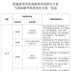 根据教育部有关规定,实行省际联考的戏曲类本科专业包括音乐表演(戏曲音乐)、作曲与作曲技术理论(戏曲音乐)、表演(戏曲表演)、戏曲表演-川剧、戏剧影视导演(戏曲导演)等,其中戏曲表演-川剧为职教本科招生专业。允许考生兼考不同专业或剧种方向。