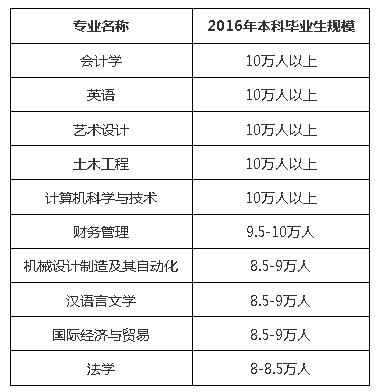 教育部阳光高考信息平台 根据教育部阳光高考信息平台最新统计数据,2016年会计学、法学等10个普通高校本科专业的毕业生规模最大,其中会计学、英语、艺术设计、土木工程和计算机科学与技术等5个专业的毕业生超过10万人。