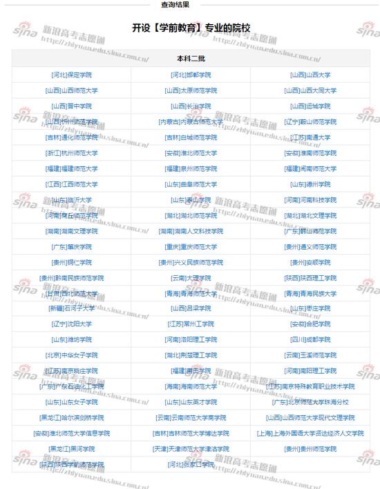 教育学类里的学前教育是近年来志愿填报的热门,是很多考生和家长关注的焦点。开设学前教育专业的院校很多,我们在新浪高考志愿通(http://zhiyuan.edu.sina.cn)中查到,除了杭州师范大学、福建师范大学这些专门的师范类院校,山西大学、南通大学等学校也在二本批次开设了学前教育专业。知道了哪些院校开设目标专业,就可以根据考生实际的分数来进行选择了,在新浪高考志愿通中,点击院校名称还可看到学校往年的录取分数线。