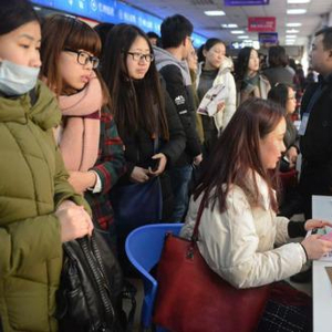 资料图:2月15日,山西太原,春节后首场高校毕业生招聘会开场,图为众多求职者被一家公司的高薪待遇吸引。韦亮 摄