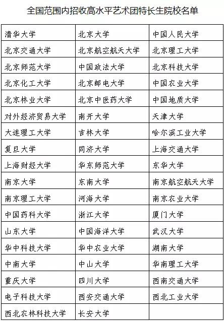 教育部规定清华大学等53所试点高校(其中我省有南京大学、东南大学、南京航空航天大学、南京理工大学、河海大学、南京农业大学、中国药科大学共7所)艺术团可在全国范围内招收高水平艺术团特长生。