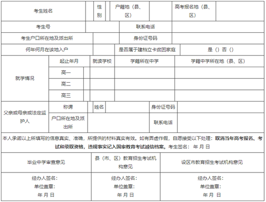 备注:须考生及其父亲或母亲或法定监护人提供的有关证明材料,以附件形式附在本表后面。