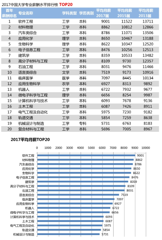 2017中国大学专业薪酬水平排行榜top20