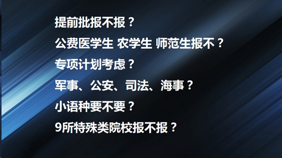 除此以外,我们可能还面临着一些批次的选择问题,比方说在很多地方都有提前批,都有公费医学生、农村生、师范生,专项计划军事、公安、司法、海事、小语种,以及一些特殊的院校,都可以在我们志愿当中进行选择。但是我们究竟要不要报这些批次,要不要报这些计划,实际上应该是需要我们认真考虑的一个事情。今天由于时间的关系,这些小的问题,就不进行一个展开的讲解,如果说各位家长有意向的批次的话,可以在讲完课之后,咨询咱们专业的老师,我们的老师会给各位家长进行一个详细的解读。