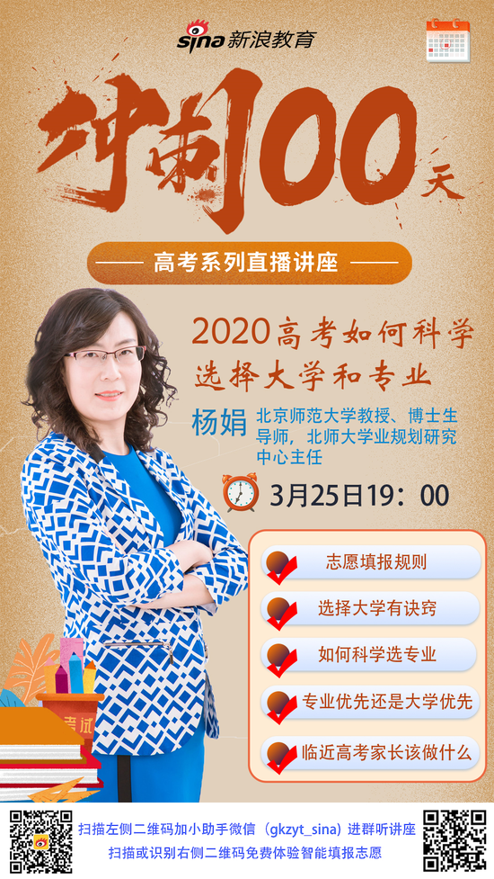 为了给广大高三家长解答这些困惑,轻松走好高考之路,新浪高考志愿通特邀北京师范大学教授、博士生导师,北师大学业规划研究中心主任 杨娟 老师进行主题讲座。本期讲座具体信息如下: