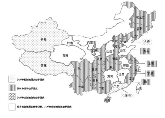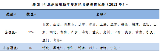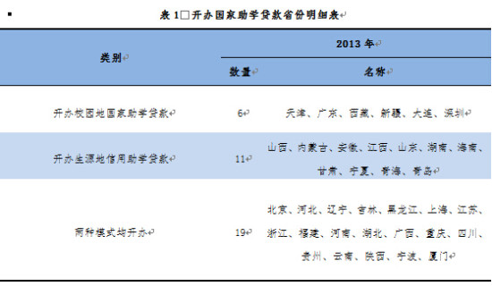国家助学贷款总体开办情况。截至2013年,全国36个省、自治区、直辖市和计划单列市(以下简称省份)均开办了国家助学贷款业务,涵盖除港、澳、台外全国所有行政区。