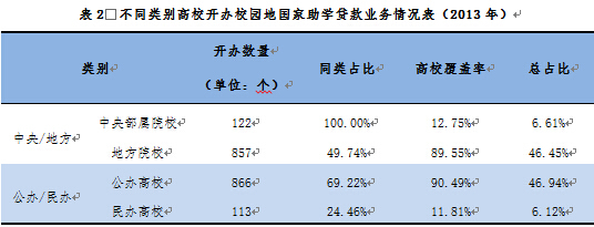 2013年校园地国家助学贷款开办情况。2013年,开办校园地国家助学贷款的高校(不含独立学院)979所(其中地方院校857所,中央部属院校122所),占全国高校总数的37.34%。开办校园地国家助学贷款的高校以公办学校为主,共计866所,占全国开办校园地国家助学贷款高校的88.45%。
