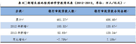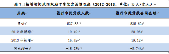 2013年校园地国家助学贷款新增审批贷款人数16.42万人,较2012年同比减少15.78%,新增银行审批贷款合同金额19.12亿元,较2012年同比减少8.74%。