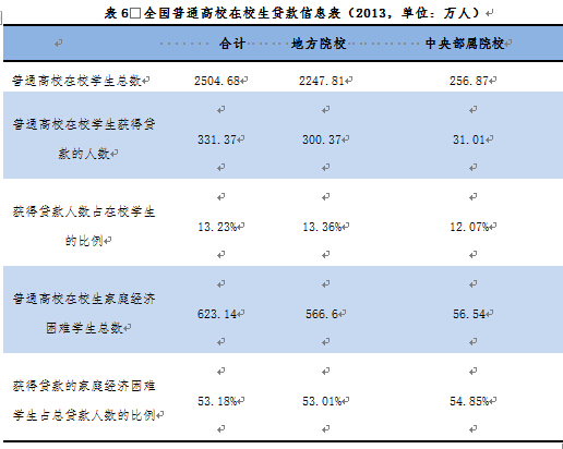 学生获贷情况。2013年高校在校学生中曾获得国家助学贷款的共有331.37万人,其中地方院校获贷人数300.37万人,中央部属院校获贷人数31.01万人。2013年全国获贷比例(获得贷款学生占在校学生总数的比例,下同)13.23%,其中,地方高校获贷比例13.36%,中央部属院校获贷比例12.07 %。2013年全国家庭经济困难学生获贷比例53.18%。