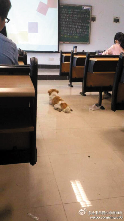 代号:“蹭课狗”,学校:华南理工大学大学城校区,“抢坐前排”从背影看,仿佛在聚精会神地“学习”,老师赶它,它也不肯走。不过华工的“蹭课狗”“态度不端正”,它才听几分钟就悻悻走了。