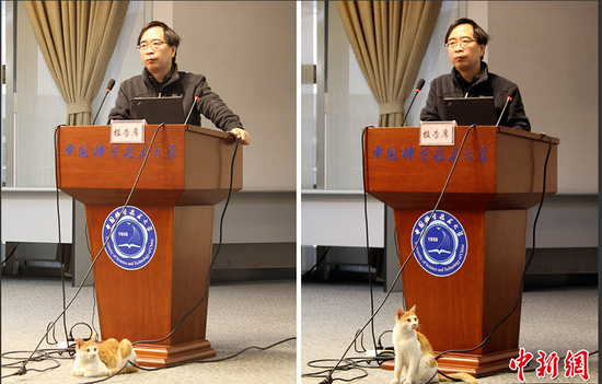 代号:学术猫,学校:中国科学技术大学东区。中国科学院院士、中科大教授潘建伟在中国科学技术大学东区主持一场报告会,讲述他量子研究方面的工作进展。一只猫闯了进来,全程淡定听课、走动、表演、休息,左图为它趴在讲台前。现在这只“学术猫”火了。