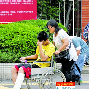 昨日下午,佛山二中考点外,一名荣山中学的考生坐着轮椅,在家长和老师陪同下前来踩点。南都记者 孙振飞摄