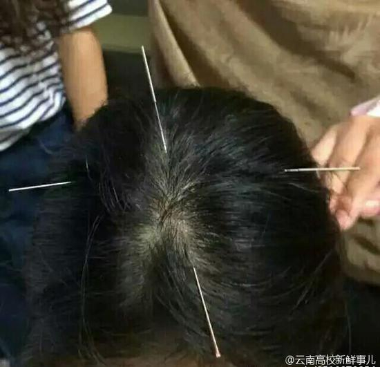 据网友爆料,云南中医学院针灸推拿专业的学生,期末考试复习时为了提神,学以致用,用银针给自己来了一个“一针提神”,一名女医学生头顶扎着针复习的照片刷爆朋友圈,但对于这些学生而言已经“习以为常”。网友纷纷感叹,“医学生的期末真的伤不起啊”,也有网友提醒,“方法虽好,没有专业技能可别轻易尝试”!