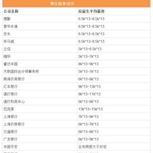 应届生的最高收入可达到27万元的年薪,以下是2016年金融行业应届生薪资表