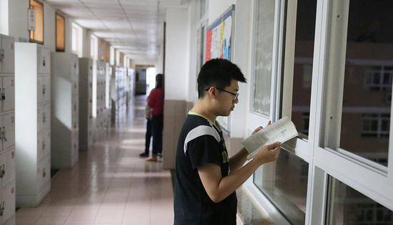 站在走廊上复习的男生。