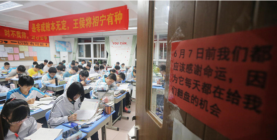 教室门外贴的字条上写着:“6月7日前我们都应该感谢命运,因为每天它都在给我们翻盘的机会。”