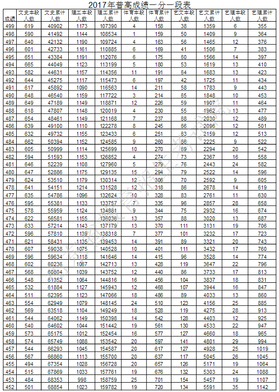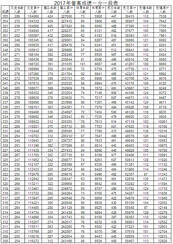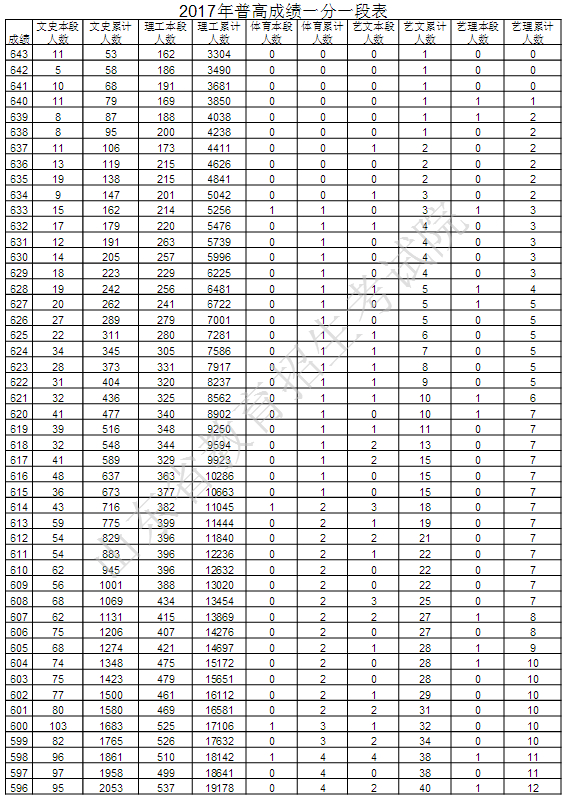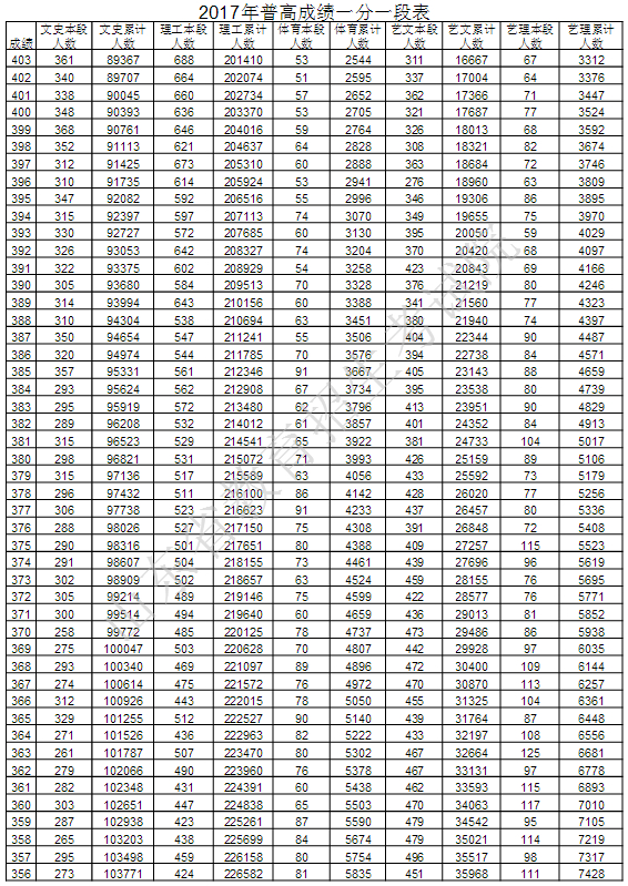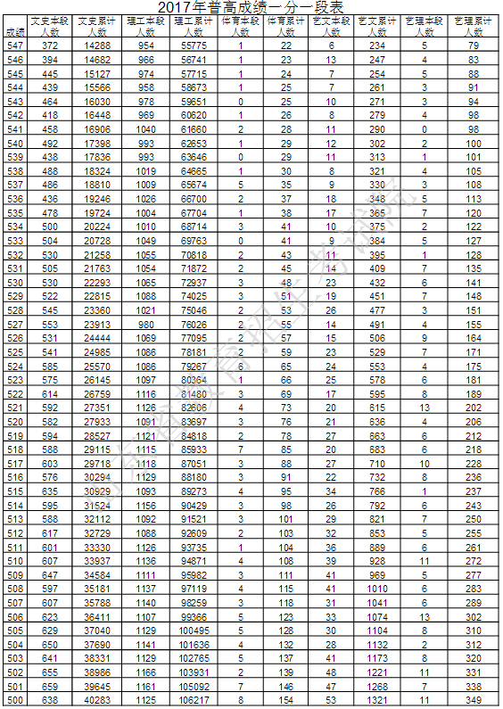 2017年普高成绩一分一段表(含文理科及体育、艺术类)