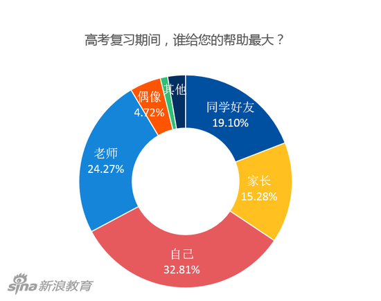 调查显示,受访00后考生认为,自己的努力在备考中作用最大(32.81%),其次是老师的帮助(24.27%),认为家长帮助最大的只占15.28%,还比不上同学好友(19.10%)。