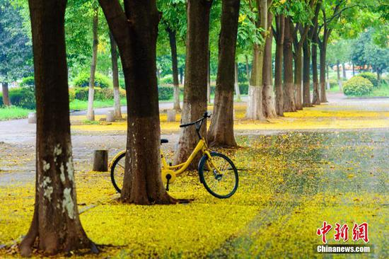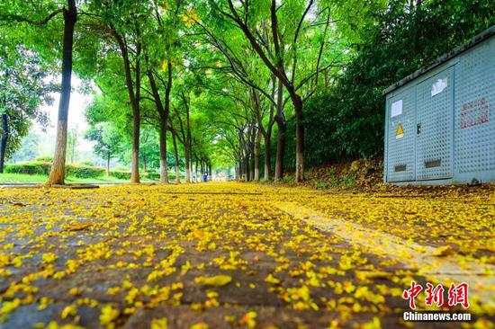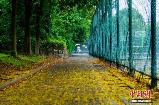 9月25日,在三峡大学,受降温和降雨影响,校园内金黄色的栾树花纷纷飘落,将树下的马路覆盖,犹如一条“黄金大道”。余东山 摄