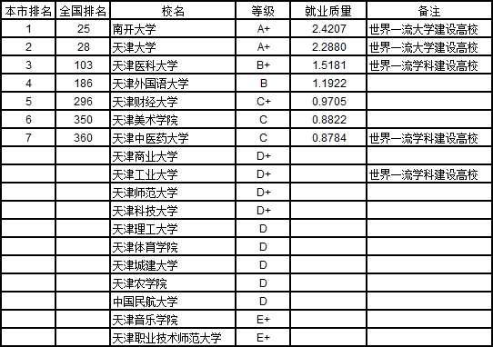2019年评价天津市18所普通本科大学,天津市大学本科生就业质量1.0081,全国第9名。
