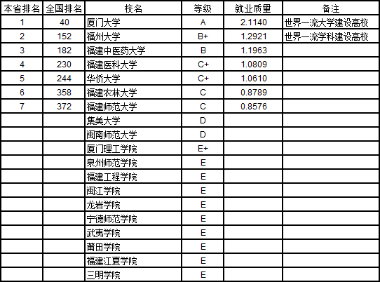 2019年评价福建省19所普通本科大学,福建省大学本科生就业质量0.7838,全国第22名。