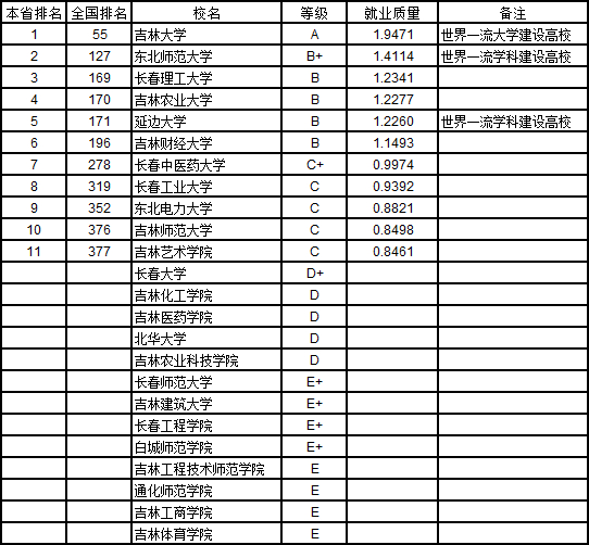 2019年评价吉林省24所普通本科大学,吉林省大学本科生就业质量0.8640,全国第16名。