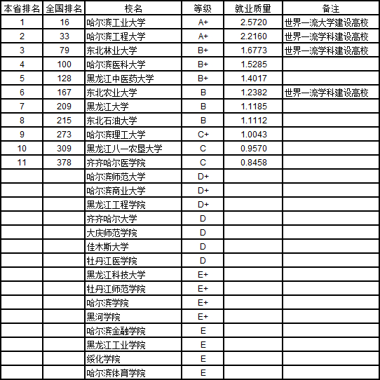 2019年评价黑龙江省26所普通本科大学,黑龙江省本科生就业质量0.9726,全国第10名。