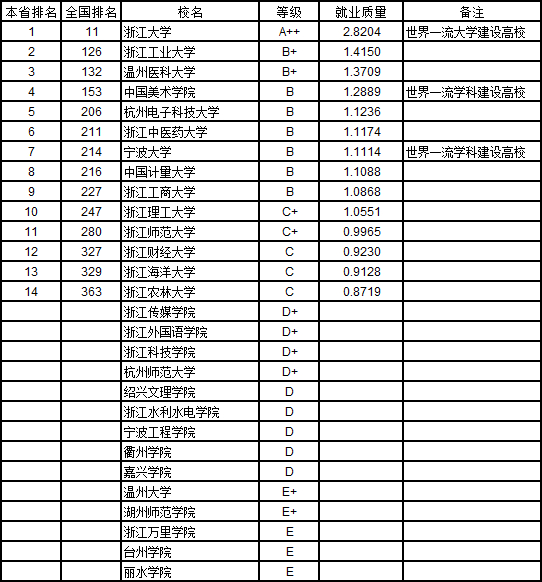 2019年评价浙江省28所普通本科大学,浙江省大学本科生就业质量0.9578,全国第11名。