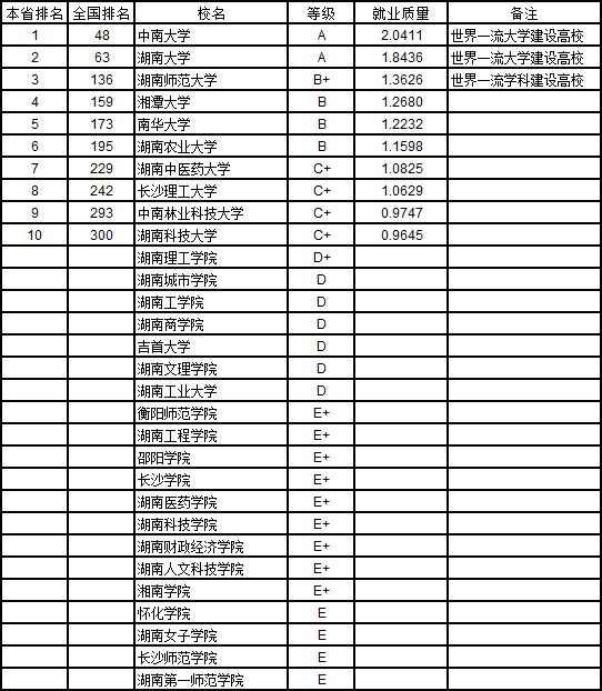 2019年评价湖南省30所普通本科大学,湖南省大学本科生就业质量0.8579,全国第17名。