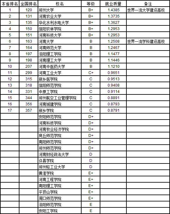 2019年评价河南省33所普通本科大学,河南省大学本科生就业质量0.9122,全国第14名。