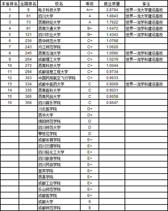 2019年评价四川省33所普通本科大学,四川省大学本科生就业质量0.9378,全国第13名。