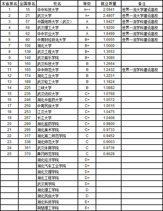 2019年评价湖北省34所普通本科大学,湖北省大学本科生就业质量1.1825,全国第4名。