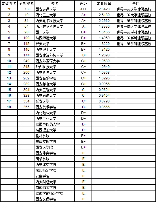 2019年评价陕西省34所普通本科大学,陕西省大学本科生就业质量1.0095,全国第8名。