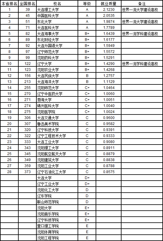 2019年评价辽宁省39所普通本科大学,辽宁省大学本科生就业质量1.0887,全国第5名。