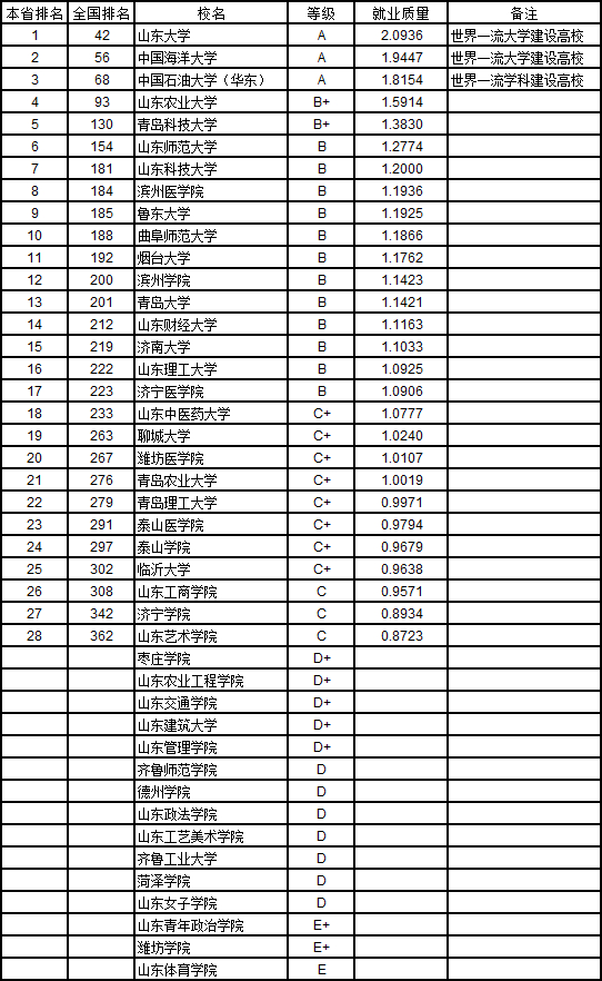 2019年评价山东省43所普通本科大学,山东省大学本科生就业质量1.0350,全国第6名。