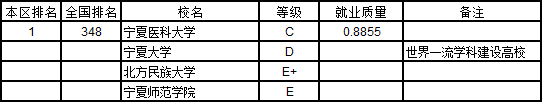 2019年评价宁夏回族自治区13所普通本科大学,宁夏回族自治区大学本科生就业质量0.6878,全国第24名。