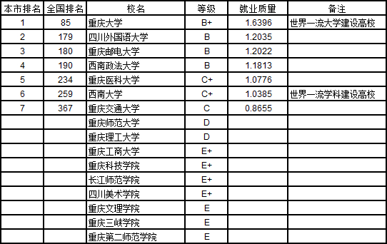 2019年评价重庆市16所普通本科大学,重庆市大学本科生就业质量0.8578,全国第18名。
