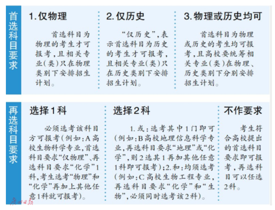 广东省招生委员会、广东省教育厅特别指出,各专业(类)选考科目要求,由普通高校根据教育部颁布的《普通高校本科招生专业选考科目要求指引(3+1+2模式)》,结合自身办学定位和专业培养目标,以及对学生学习要求自主确定。因培养要求不同,相同专业(类)在不同高校可能会有不同的选考科目要求。比如,记者发现,中山大学的历史学专业首选科目为“物理或历史均可”,而暨南大学的历史学专业首选科目为“仅历史”。