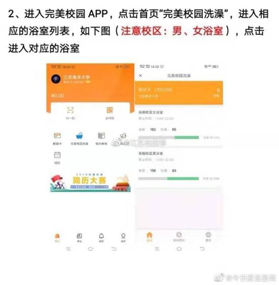 据学生微博反映,由于“学校洗浴系统配合校园卡系统进行升级改造”,目前只能通过一款名叫“完美校园”的App进行预约洗澡。但App预约程序复杂,很多学生不知道怎么操作。