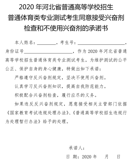 1。签订《2020年河北省普通高等学校招生普通体育类专业测试考生同意接受兴奋剂检查和不使用兴奋剂的承诺书》(见附件2)。