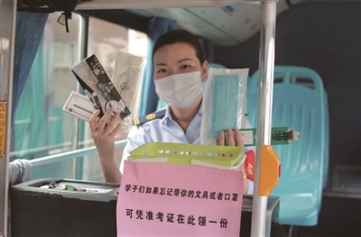 “学子们如果忘记带你的文具或者口罩,可凭准考证在此领一份。”昨天上午,南京公交六合客运公司501路公交司机郑建柱和乘务员李苗在忙着打扫车内卫生之余,把一张提示卡片贴在了车厢的醒目位置,他们准备了崭新的文具和口罩,希望能在即将到来的高考中为考生们提供帮助。