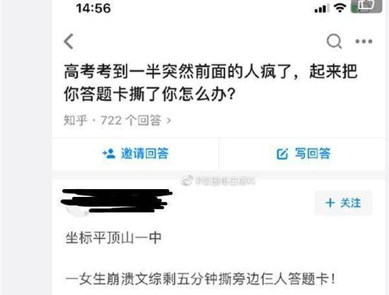 原标题:平顶山招办回应“考生撕他人答题卡”:部分考题不会做,心态失控所致