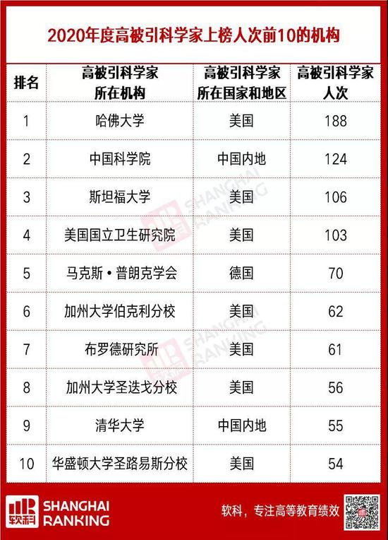 中国科学院入选科学家数量排名全球机构第2位,清华大学从去年排名第19位上升到今年的第9位,一举跻身前十。中国科学技术大学、北京大学和浙江大学在2020年排名也进入榜单前列。