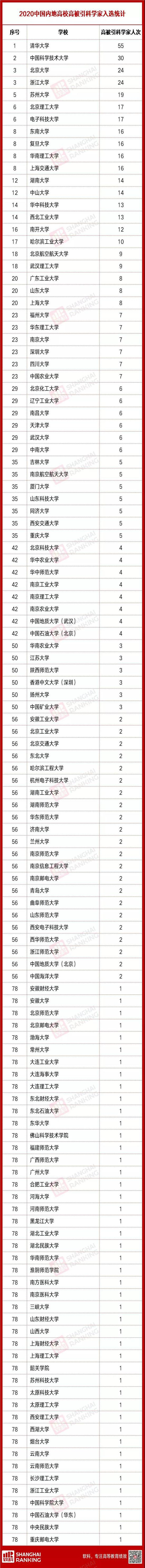 在中国内地上榜科学家中,有621人来自123所高校。从中国内地高校入选数统计来看,清华大学位居首位,达55人次;中国科学技术大学有30人次,位居第二;北京大学和浙江大学各24人次,并列第三。