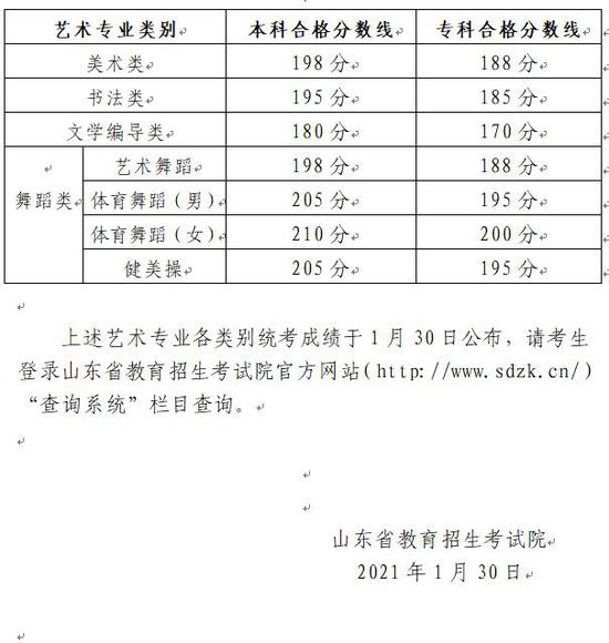 山东省2021年普通高校招生美术类、文学编导类、书法类、舞蹈类专业统考合格分数线公布。