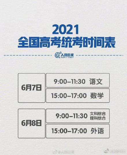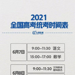 教育部网站2月19日发布《教育部关于做好2021年普通高校招生工作的通知》。全国统考于6月7日开始举行,具体科目考试时间安排为:6月7日9:00至11:30语文;15:00至17:00数学。6月8日9:00至11:30文科综合/理科综合;15:00至17:00外语,有外语听力测试内容的应安排在外语笔试考试开始前进行。