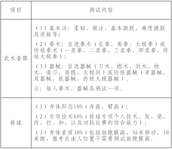 ①报考武术套路项目、女子排球项目的考生需参加我校组织的专业测试。