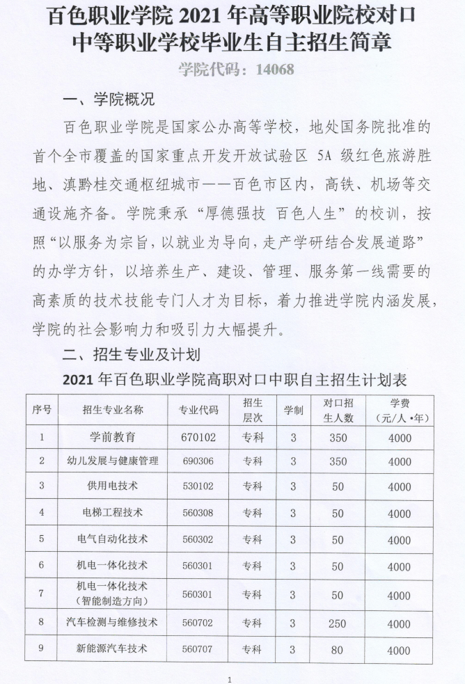 百色职业学院2021年高等职业院校对口中等职业学校毕业生自主招生简章